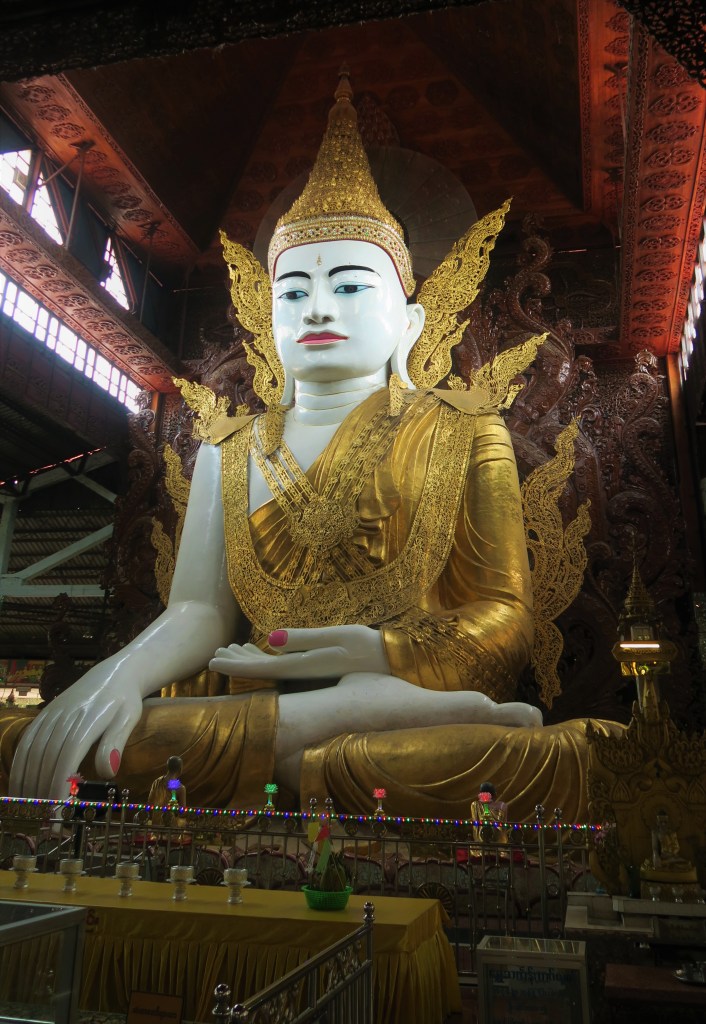 Nuestra siguiente parada fue para visitar Nga Htat Gyi Buddha, un gigante Buda sentado que se encuentra en el interior de una Pagoda. Es un lugar menos turístico que el anterior, así que podréis presenciar la rutina de la gente de Myanmar acudiendo al templo a hacer ofrendas y rezar.
