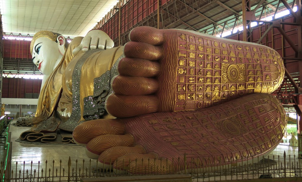 Muy cerquita de este Buda se encuentra otro que está reclinado, Chauk Htat Gyi Buddha. Allí conocimos a un monje budista que nos explicó la historia de este Buda, el cual mide 66 metros de longitud. Nos acompañó mientras rodeábamos el Buda y nos fue explicando sus carácterísticas, como que los pies miden 10 metros cada uno y contienen mas de 100 grabados que representan las cualidades de Buda. Además también nos habló de la historia de Buda y de cómo es importante para ellos seguir sus enseñanzas, ya que cualquiera puede convertirse en el siguiente Buda.