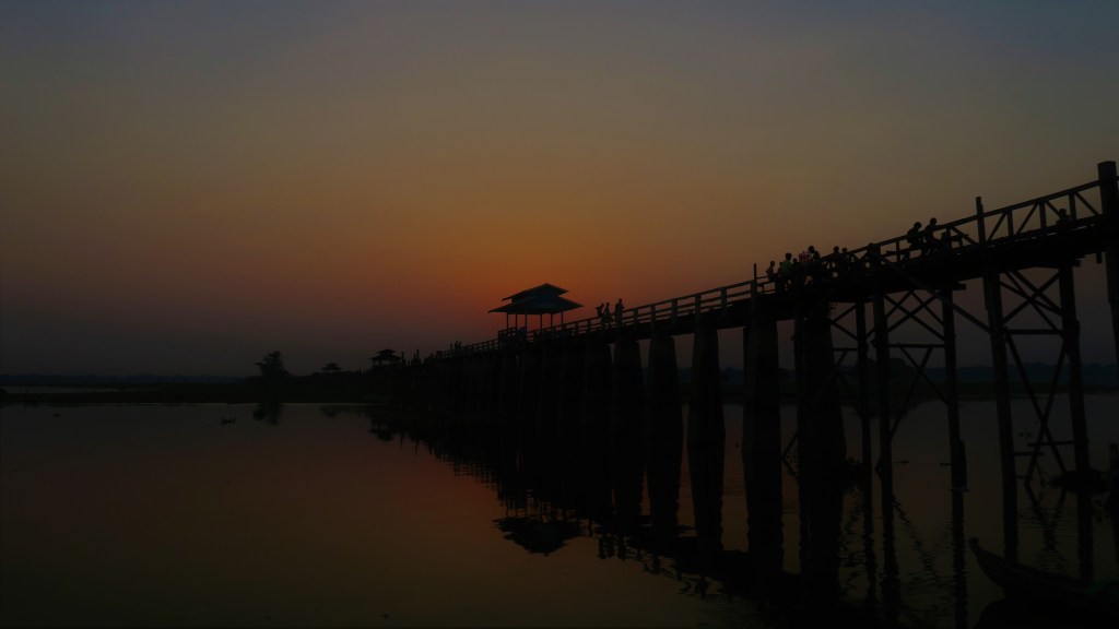 Otro lugar que se visitar es el punte U-Bein, hecho de madera de Teca. Es el más largo del mundo construido en este tipo de madera, aunque no es famoso solo por eso, si no por la vida y tránsito que hay en él. Lo ideal es visitarlo una vez por la mañana, al amancer, y otra por la tarde para disfrutar de un atardecer que nunca olvidaréis. Todas las mañanas cuando sale el sol, decenas de monjes cruzan el puente para comernzar sus quehaceres y sin duda es una de las imágenes más significativas y buscadas de este lugar. Si vais en el aterdecer, como hicimos nosotros, disfrutaréis de unos colores preciosos mientras el sol se esconde detrás del puente. Por la zona, a la orilla del río, hay terrazas en las que podéis tomaros una cerveza local y disfrutar del espectáculo y nada más. Sin duda un momento tan mágico como único.