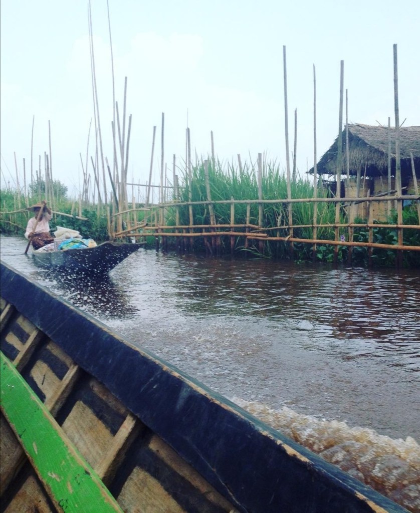 Tras el trekking, llega una de las partes más emocionantes, la de subirse en una barca y recorrer el río hasta llegar a Inle. Es un reocrrido precioso en el que se está constantemente rodeado de naturalez. Pudimos ver a los pescadores en sus pequeñas barcas con las redes enormes tan típicas de Myanmar, vimos plantas marinas que subían a la superficie y casas de madera sobre altos palos para no verse afectadas por las subidas de la marea.