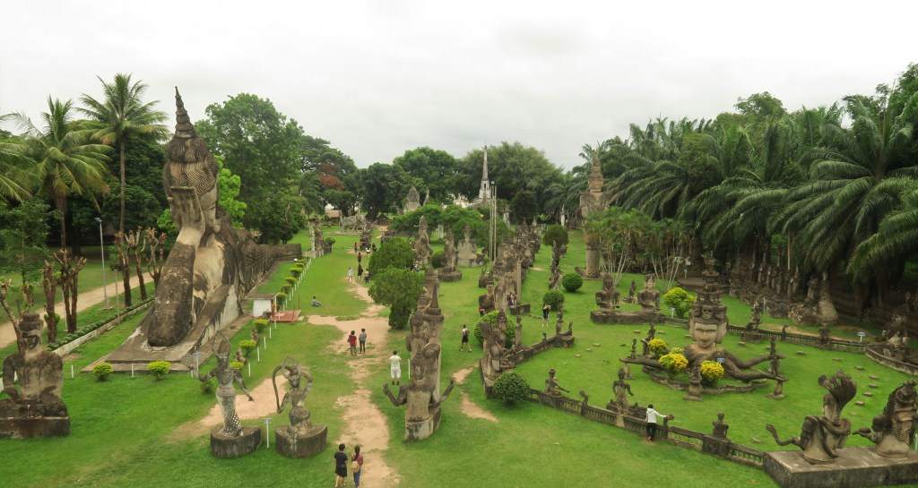 Nuestro segundo día cogimos una moto en el hostel y fuimos a visitar el conocido Buda Park, que es un parque con jardines y decenas de Budas por todas partes. Podéis encontrar también imágenes Hinduistas de algunos Dioses como Shiva. La verdad es que si os gustan las imágenes de Buda es una visita entretenida. A una de las esculturas, la Torre de Calabaza incluso se podía entrar y subir por unas escaleras enanas y nada accesibles para ver todo el parque desde arriba.