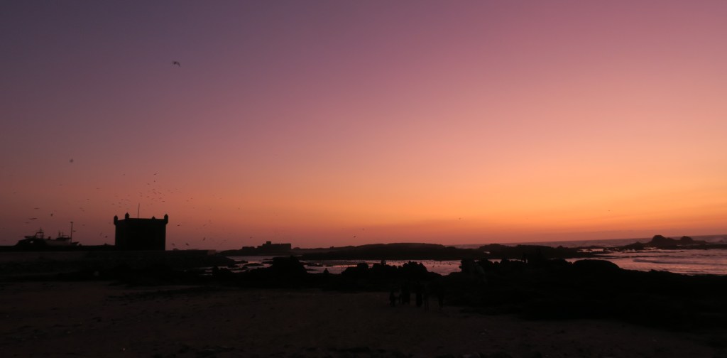 Comimos cerca del hostel en un sitio local muy barato y con pescado fresco muy rico y nos fuimos a pasar la tarde a la playa. Como en nuestro hostel teníamos terraza en la azotea, nos fuimos allí a ver el atardecer que nos dejó unas vistas muy bonitas. Esa noche nuestro hostel ofrecía una cena tradicional, así que en lugar de ir a la zona de medina nos quedamos a cenar con más gente que se alojaba allí. El menú estuvo buenísimo y nos dejó llenísimos, así que para bajarlo fuimos a dar una vuelta por el paseo marítimo.