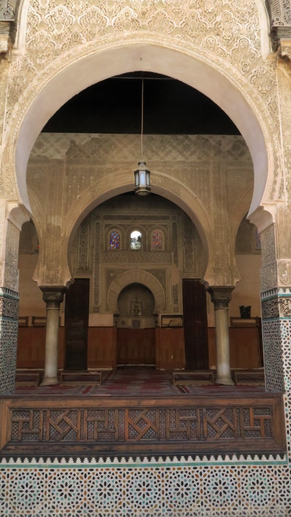 Nuestro primer día fuimos a visitar los lugares más emblemáticos durante la mañana. En primer lugar, como estaba cerca de nuestro hotel, fuimos a Bab Boujloud, la puerta azul, una de las principales de acceso a la ciudad. Después fuimos a A Madrasa Bou Inania, una escuela islámica del sigo XIV con preciosas puertas y pararedes, se puede acceder al patio interior y maravillarte con esas paredes llenas de formas y color.