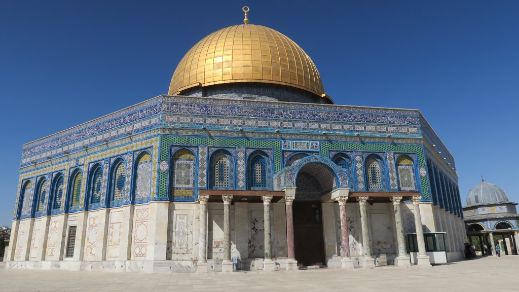 Tras cruzar la pasarela llegas a la explanada donde se encuentran la Mezquita de Al-Aqsa y la increíble Cúpula de la Roca, uno de los templos más bonitos que he visto nunca. Su forma y colores crean un conjunto espectacular.