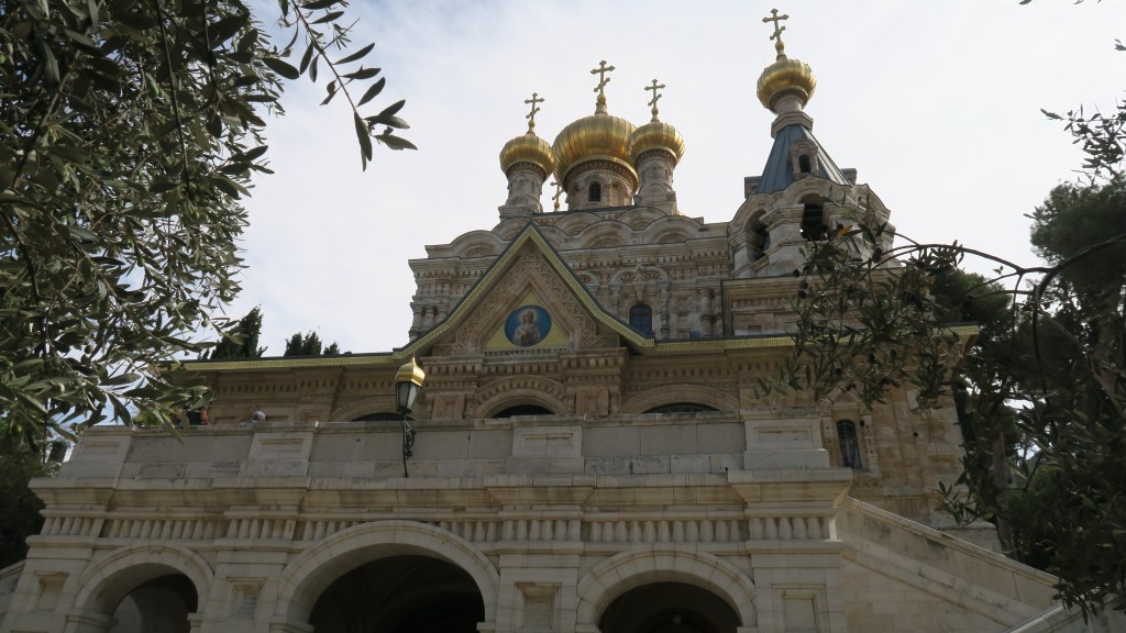 Continúamos subiendo y pasamos por la Iglesia de Santa María Magdalena, la cual llama mucho la atención por sus siete cúpulas doradas que se van alzando a medida que vas subiendo hacia el Monte de los Olivos. La entrada a la iglesia está algo escondida, no llama mcho la atención, es como una entrada hacia unos jardines, tienes que subir varias escaleras de piedra y verás las cúpulas doradas aparecer entre los árboles. Esta iglesia es muy diferente al resto de la zona ya que fue creada por el Zar ruso Alejandro III y el estilo de la arquitectura de su país está plasmado en el edificio.
