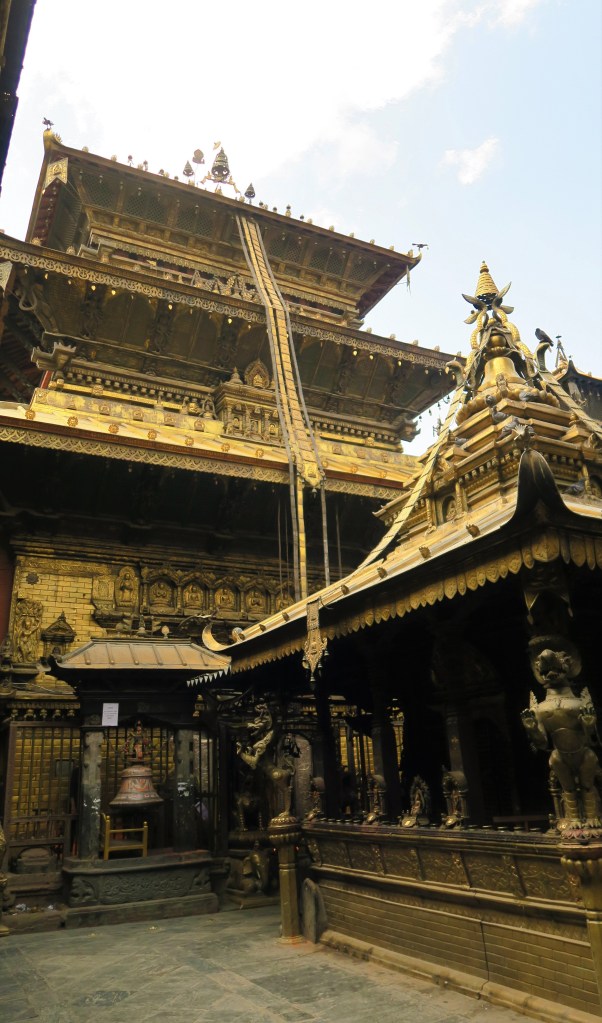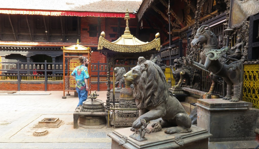 Despúes volvimos para el centro, comimos algo tarde y visitamos Durbar Square, la plaza principal de la ciudad. Para acceder a ella hay que pagar y en teoría ese dinero se destina a la reconstrucción de la plaza. Nosotros fuimos en 2017, con lo que había zonas en reconstrucción y aún recuperándose del terremoto que la ciudad sufrió en 2015. La plaza es patrimonio de la Unesco y en en el interior de la se encuentran nada menos que 50 templos.