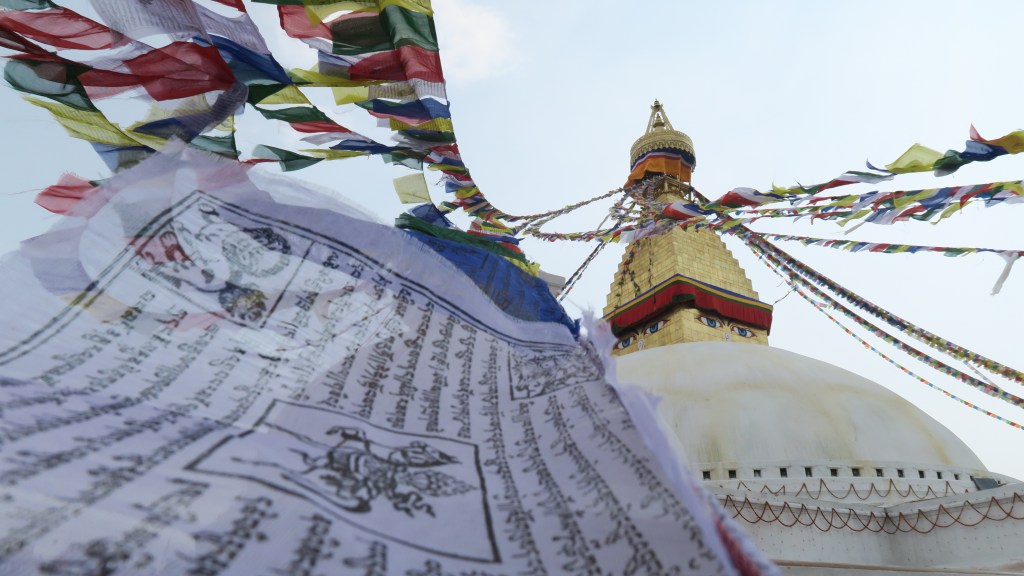 El tercer día fuimos a visitar el templo de Boudhanath Pashupatinath, el más antiguo e importante de la ciudad. Allí se encuentra la estupa más grande del país y sobre ella volvemos a encontrar los ojos de Buda. El lugar es como una plaza circular con la estupa en el centro. Está toda decorada con los famosos banderines nepalíes, los cuales representan a los chakras, por eso hay 7 cada uno del color de uno de los chakras. Para entrar hay que pagar entrada y dentro se mezclan tanto fieles que peregrinan allí como turistas.
