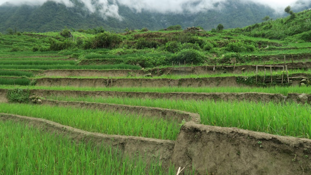 Hoy no llovió pero eso no significó que el trekking fuera más fácil. La primera parte del recorrido fue subiendo para llegar a un punto alto en el que la vista de los arrozales era impresionante. Después, tuvimos que bajar la pendiente y por un tiempo y tuvimos que reducir el ritmo ya que estaba muy embarrado y resbaladizo. Fue muy gracioso ver como la gente intentaba mantener el equilibrio de cualquier manera para no bajar rodando sobre el barro. Después, el camino fue más fácil y logramos ver más cerca los arrozales y una vez incluso pasamos por uno de ellos.