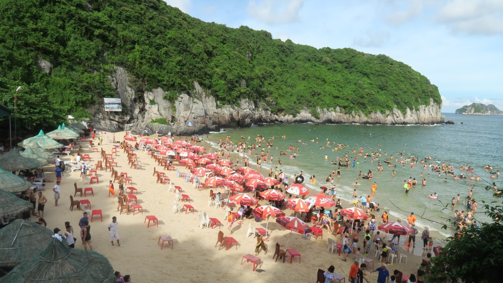 Nuestro primer día en Cat Ba, el lo pasamos el día por las playas de la isla. Llegamos por la mañana y tras dejar las cosas fuimos a Cat Co 1, la playa más cercana al centro. Es una especie de cala no muy amplia que a partir de la hora de comer se llena de turistas locales y chinos con chaleco salvavidas, con lo que se convierte en un lugar bastante ruidoso y concurrido, así que es mejor ir por la mañana. Desde allí se puede acceder caminando a Cat Co 2 y Cat Co 3, las otras dos playas de la isla, algo menos concurridas y más amplias. Por la noche dimos un paseo por el paseo marítimo y cenamos en una de sus terrazas.