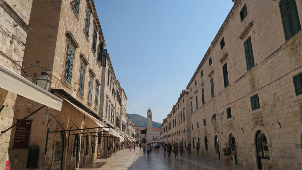 Al entrar a la ciudad antigua encontrarás Stradum, la calle principal que te lleva hasta la Torre del reloj. Te recomiendo callejear tranquilamente por las calles de su alrededor sin un rumbo fijo, observando sus largas escaleras, sus bonitos rincones y parando a tomar algo en alguno de sus muchos bares o cafeterías. Dubrovnik invita a caminar observando sus largas escaleras, pasando de una calle a otra por estrechos callejones y admirando sus altos edificios con coloridos ventanales. Al atardecer la experiencia es más bonita ya que el sol baja y la luz va colándose y escondiéndose por las calles.