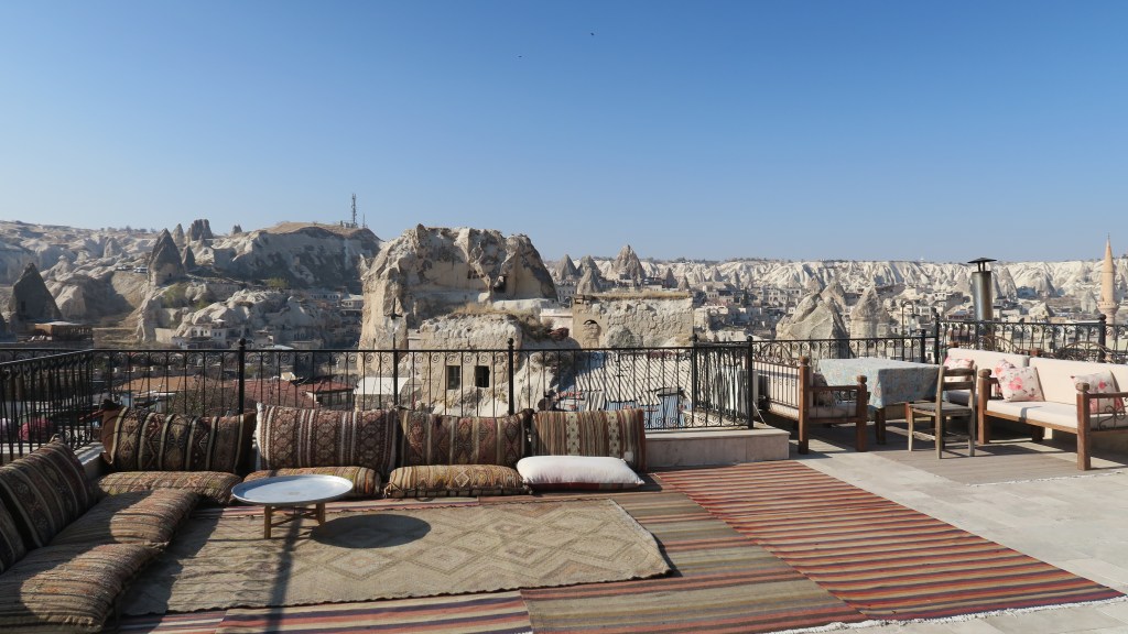 Nosotros no íbamos a coger coche con lo que optamos por Goreme ya que desde allí se puede llegar andando o rápidamente en taxi a varios valles. Nos quedamos en Goreme Mansion, un pequeño hotel con habitaciones de piedra muy bien cuidadas, limpias y amplias, tiene también un comedor y una bonita terraza. El servicio fue de 10 y nos organizaron los traslados al aeropuerto, la excursión en globo y la del quad a buen precio.