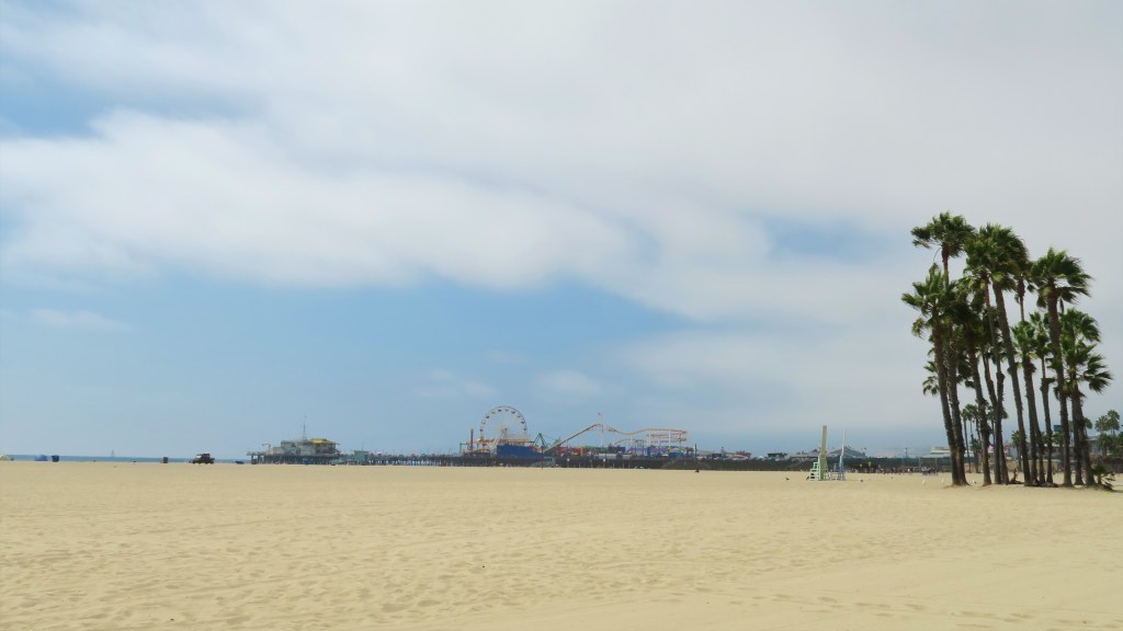 Durante nuestro día allí disfrutamos de la playa (donde vimos por primera vez las famosas casetas de los vigilantes de la playa), paseamos por las zonas peatonales que están llenas de ciclistas, skaters y deportistas y después nos dirigimos a 3rd Promenade, una de las calles principales de Santa Mónica llena de tiendas y restaurantes. Cominos por allí y después de un poco de sobremesa volvimos para la playa. Antes de que terminara la tarde fuimos a ver el famoso Pier de Santa Mónica que tantas veces habíamos visto en la tele. Es un muelle con una feria en el que puedes comer, montar en atracciones o subirte a la emblemática noria. Paseamos por allí y vimos el atardecer que nos regaló unas vistas muy bonitas para terminar el día de playa.