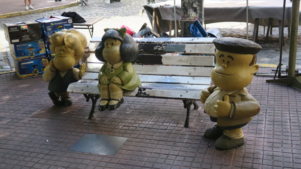 Pasamos por la Plaza Dorrego, rodeada de bonitos edificios del siglo XIX y llena de cafeterías. Entre puesto y puesto encontramos el banco de Mafalda, el cual se encuentra en la calle Chile esquina con calle Defensa. Desde aquí, seguimos el Paseo de la Historieta conociendo a distintos personajes de las viñetas argentinas.